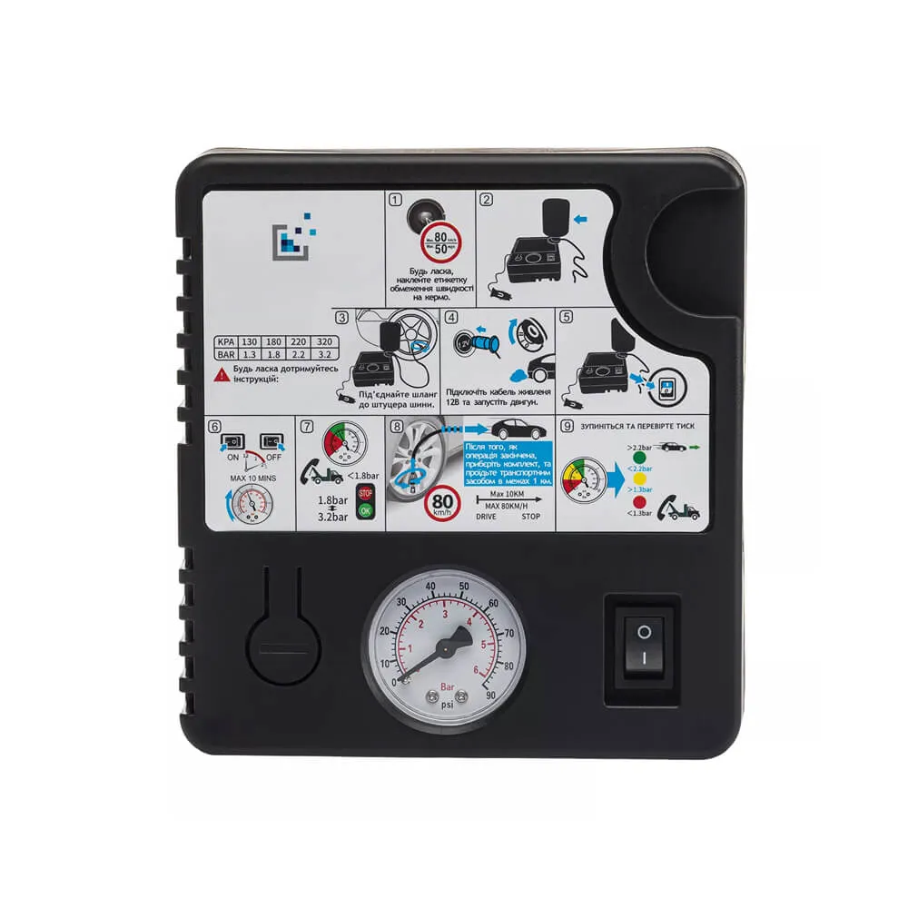 A portable tire inflator for quick inflation, with a pressure gauge and auto shut-off.